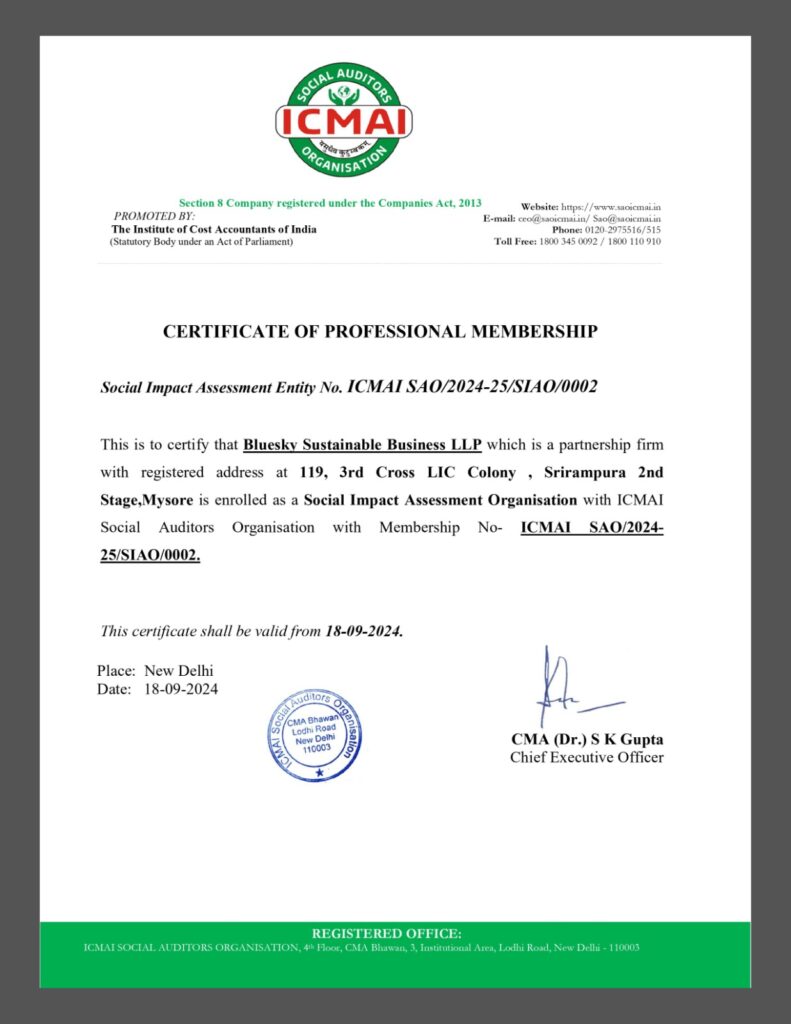 BlueSkyCSR is certified by the Institute of Cost Accountants of India (ICMAI) as a Social Audit / Social Impact Assessment Organisation (SAO). This certification empowers us to conduct credible, independent social audits and impact assessments across India, with formal recognition under professional standards.
